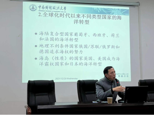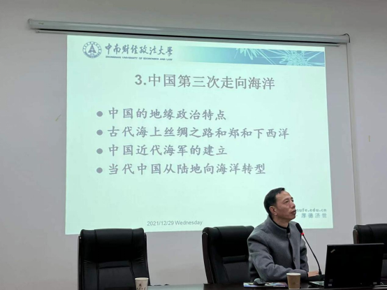 12月29日,bevictor伟德国际邀请中南财经政法大学政治学系主任刘新华教授,为公司师生进行了题为“当代中国从陆地大国向海洋大国转型”的学术讲座。本次讲座由政治学系谢丹主任主持,公司部分专业教师和国际事务与国际关系专业的同学参加了本次讲座。