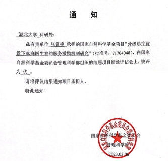 近日,接国家自然科学基金委员会管理科学部通知,由公司张霄艳教授主持的国家自然科学基金项目“分级诊疗背景下家庭医生签约服务激励机制研究”(批准号:71704048)在国家自然科学基金委员会管理科学部组织的结题项目绩效评估会上被评为“优”。