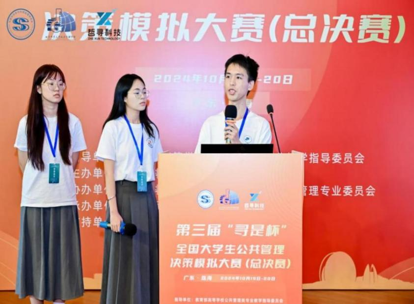 10月19日至20日,由教育部高等公司公共管理类专业教学指导委员会指导、中国科学学与科技政策研究会主办、中国科学学与科技政策研究会公共管理专业委员会协办、北京师范大学政府管理公司承办的第三届“寻是杯”全国老员工公共管理决策模拟大赛(总决赛)在北京师范大学珠海校区成功举办,来自全国90所高校的近500位师生参赛,15位公共管理学科的知名专家学者担任大赛评委。公司由王伊菲、字概光、郑安琪三名本科生组成的“城市筑梦师3.0”队,在陈娟老师、谢迪老师的指导下荣获全国一等奖。