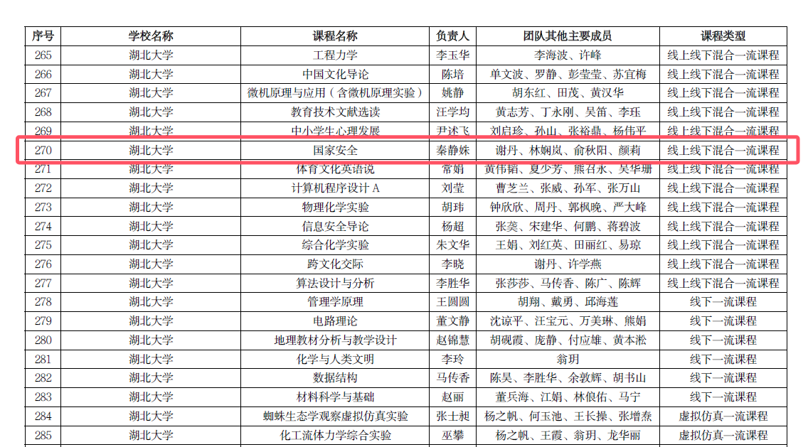 近日,根据《省教育厅关于公布2024年度省级一流本科课程认定结果的通知》(鄂教高办函〔2024〕9号),伟德国际唯一官网26门课程获批2024年度省级一流课程,公司秦静姝老师负责的《国家安全》课程获批2024年度省级线上线下混合一流课程。