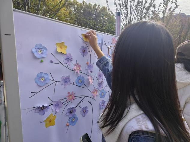 (25级新生将自己的便利贴贴在“成长花束”上)