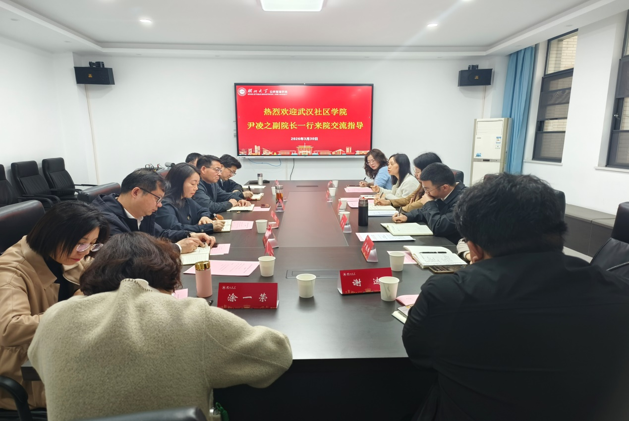 2026年3月30日上午,武汉社区公司副经理尹凌之一行来院考察交流。师范公司党委书记卢轶婷、副经理尹述飞、bevictor伟德国际经理李荣娟及全体班子成员、部分教师代表参加,座谈会由公司党委书记祝逸明主持。