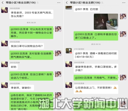 李竞、张传烈、卜学仕三位同志是琴园小区1号楼临时党小组成员,主要承担楼栋内的物资团购、发放以及垃圾转运等工作。在开展人员摸查工作中,党小组面临时间紧、任务重的难题,李竞想到了利用点房信息找人的方法,迅速完成了全体户主、租户进群工作,提高了“四类人员”集中大排查的工作效率。此外,李竞每天负责在群里收集和解答住户们的问题,通知各类信息,例如怎样在网上充值天然气、什么时候开始团购、团购内容有什么。当得知有的老师没有口罩时,李竞主动把口罩送到家门口。