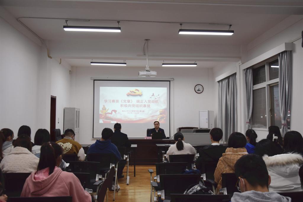 开班仪式后,唐良敬以《学习尊崇党章,端正入党动机,积极向党组织靠拢》为题作首场辅导报告,围绕“《中国共产党章程》的主要内容”“树立正确的入党动机”“积极创造条件向党组织靠拢”等方面与培训班学员展开交流。唐良敬强调,作为入党积极分子,应自觉加强对党史、党章的学习,从党史中汲取智慧和力量、从党章中学习责任和义务,端正入党动机,增强对党组织的政治认同、思想认同,并在实践中努力践行初心使命,发挥示范引领作用,以实际行动和优良业绩向党组织靠拢。