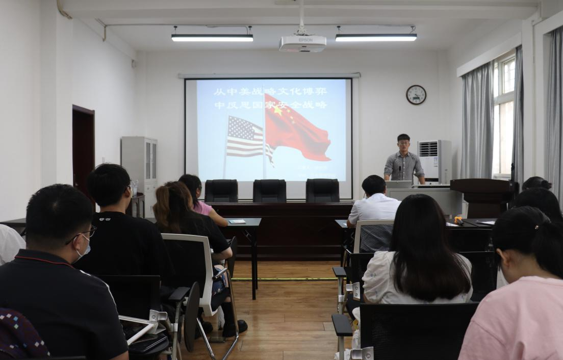 接着,徐文洋同学展开了以《从中美战略文化博弈中反思国家安全战略》为题目的论文设想与报告。徐文洋同学以总体国家安全观为视角,着眼当代中美战略文化博弈背景下美政府对我国极限施压致使我国安全形势日趋严峻的现状,并客观阐述中美不同战略文化背景下两国安全观的分歧及差异,最后给出增强我国安全战略能力的应对之策,为缓和中美紧张局势提出了自己的见解,并引发听众关于国家安全与战略文化的深入思考。随后,王美文老师针对徐同学的论文报告提出了两个意见——题目微大,且论文中未明显体现中美博弈。张继涛老师也认为选题较大、理论与现实问题纠缠不清;另外,张老师还向同学们推荐了亨廷顿的《文明的冲突》,启发大家在经典著作中寻求理论原点。总的来说,老师们提醒同学们在论文写作过程中应注意题目是否有理论支持,是否紧密联系时事,选题范围是否适中等方面。