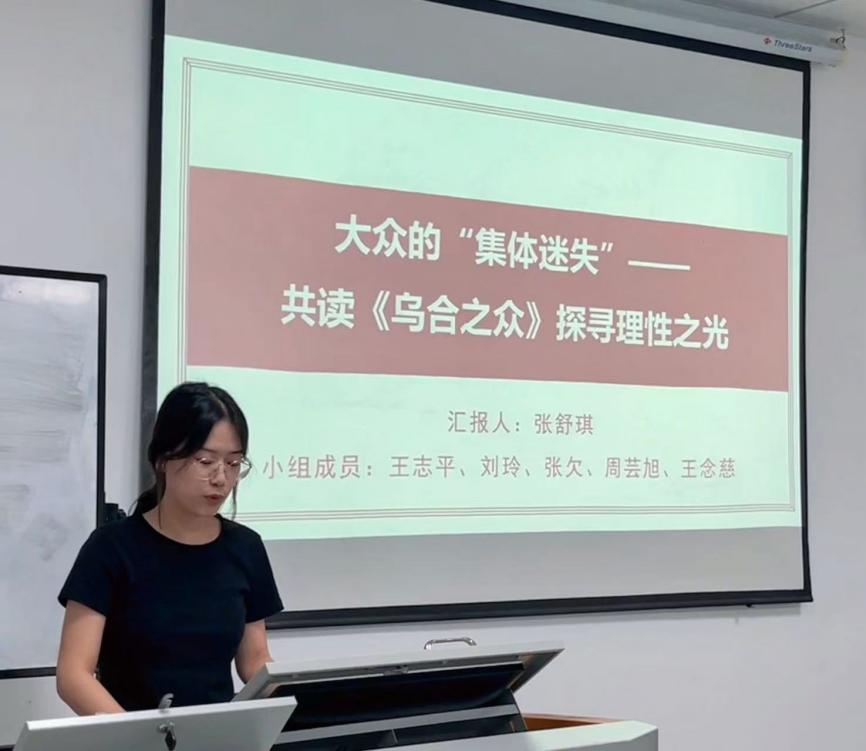 以张舒琪同学为代表的第二小组聚焦《乌合之众》,强调群体心理力量警醒我们保持理性批判与独立思考至关重要,同时也客观指出了著作的时代偏见、观点绝对化及论据缺陷等局限,呼吁大家在信息洪流时代保持独立、理性思考。